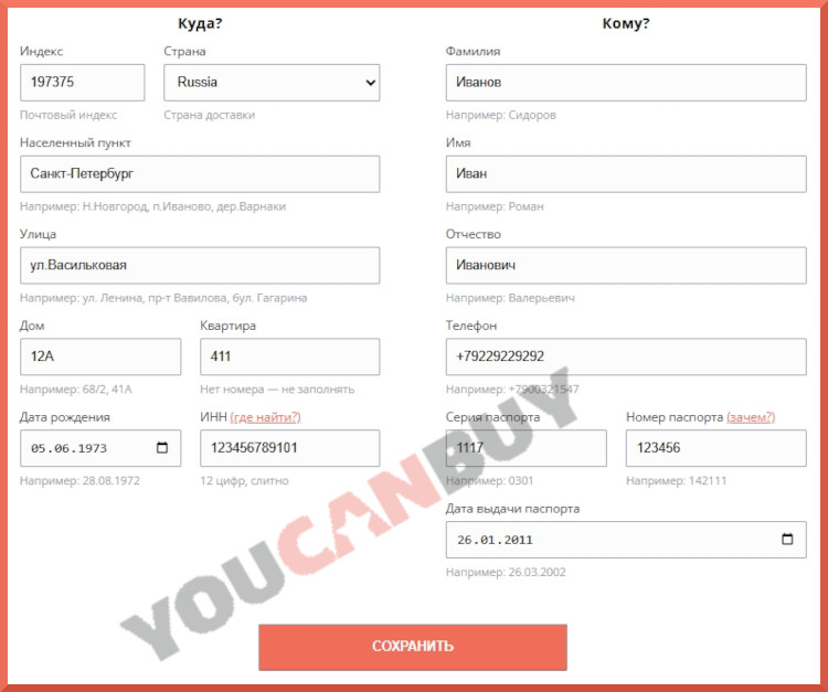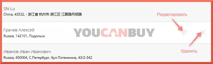 Для добавления нового адреса доставки требуется заполнение соответствующей формы. Необходимо предельно внимательно и правильно ввести все данные, т.к. достоверность указанной информации влияет на саму возможность доставки и таможенное оформление посылки. Необходимо быть особенно внимательным при использовании экспресс-доставки YouCanBuy(mini). Обратите внимание, все данные необходимо указывать только на русском языке.