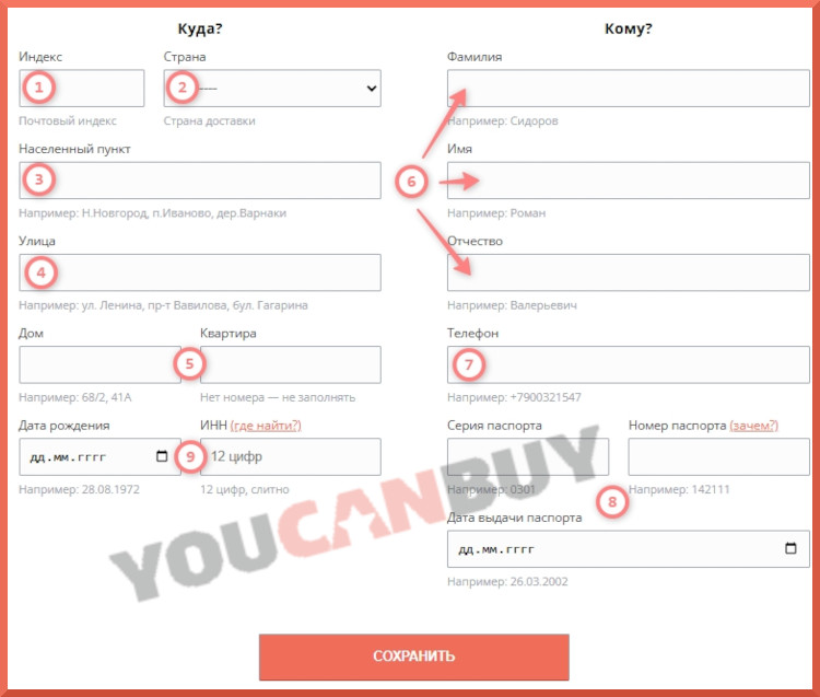 9. Дата рождения/ИНН. Для таможенного оформления экспресс-грузов в РФ, согласно требованию законодательства, требуется указание дополнительных данных получателя, таких как дата рождения и ИНН (индивидуальный номер налогоплательщика). Узнать свой номер ИНН можно на сайте ФНС России. Поля обязательны к заполнению только при отправке посылок доставкой YouCanBuy(mini).